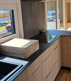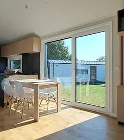 El interior de la autocaravana modelo A consta de un amplio salón con techo inclinado, un cuarto de baño y, según la versión, dos o tres dormitorios. La distribución funcional garantiza una vida cómoda para una familia de cuatro miembros, tanto si se trata de un chalet móvil de temporada como de una vivienda para todo el año. Los grandes ventanales y las puertas francesas contribuyen a la sensación de amplitud del interior.