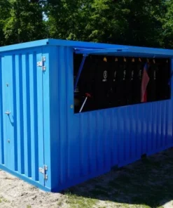 El contenedor bar mide aproximadamente 4×2 metros y tiene un toldo plegable, las dimensiones son aproximadamente las mismas que las de un contenedor desmontable de 16 pies. Esto es ideal para las personas que esperan secarse y hace que el recipiente parezca una barra real. La marquesina también se puede cerrar y bloquear, lo que permite dejar de forma segura el contenedor de la barra con las pertenencias en su interior. Además, en el lado corto hay una puerta doble que permite introducir objetos voluminosos como, por ejemplo, un barril de cerveza o un frigorífico. Un contenedor de bar sencillo pero resistente.