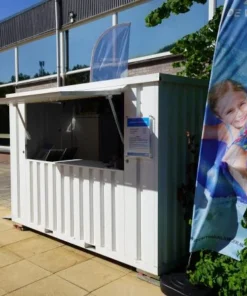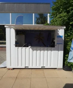 El contenedor de barra plegable blanco mide aproximadamente 3×2 metros y tiene un dosel plegable; las dimensiones son aproximadamente las mismas que las de un contenedor plegable de 10 pies. Esto es ideal para las personas que esperan que se seque y hace que el recipiente parezca una barra real. La marquesina también se puede cerrar con llave, por lo que el contenedor de bar se puede dejar con las pertenencias dentro de forma segura. Además, hay una puerta doble en el lado pequeño que permite introducir objetos voluminosos como un barril de cerveza. Por tanto, es la solución ideal para ofrecer un bar durante los eventos. Un contenedor de bar sencillo pero resistente en un color elegante y limpio como el blanco, RAL 9016.