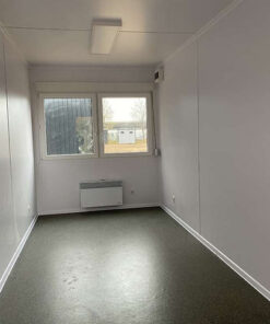 PVC – entrada 380 V, 32 A, 5 polos;1 caja de fusibles y distribuidores, 2 lámparas LED, 1 interruptor, enchufes dobles de 230 V, ventanas y protección solar – 1 ventana doble / 200 cm x 120 cm y persianas enrollables de PVC 1 puerta – 200 cm x 90 cm